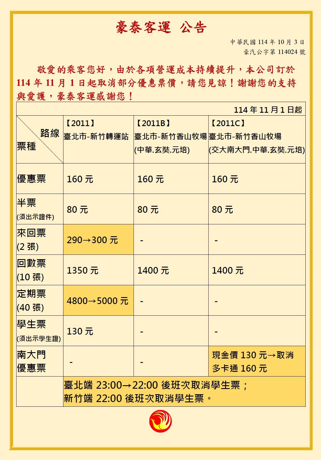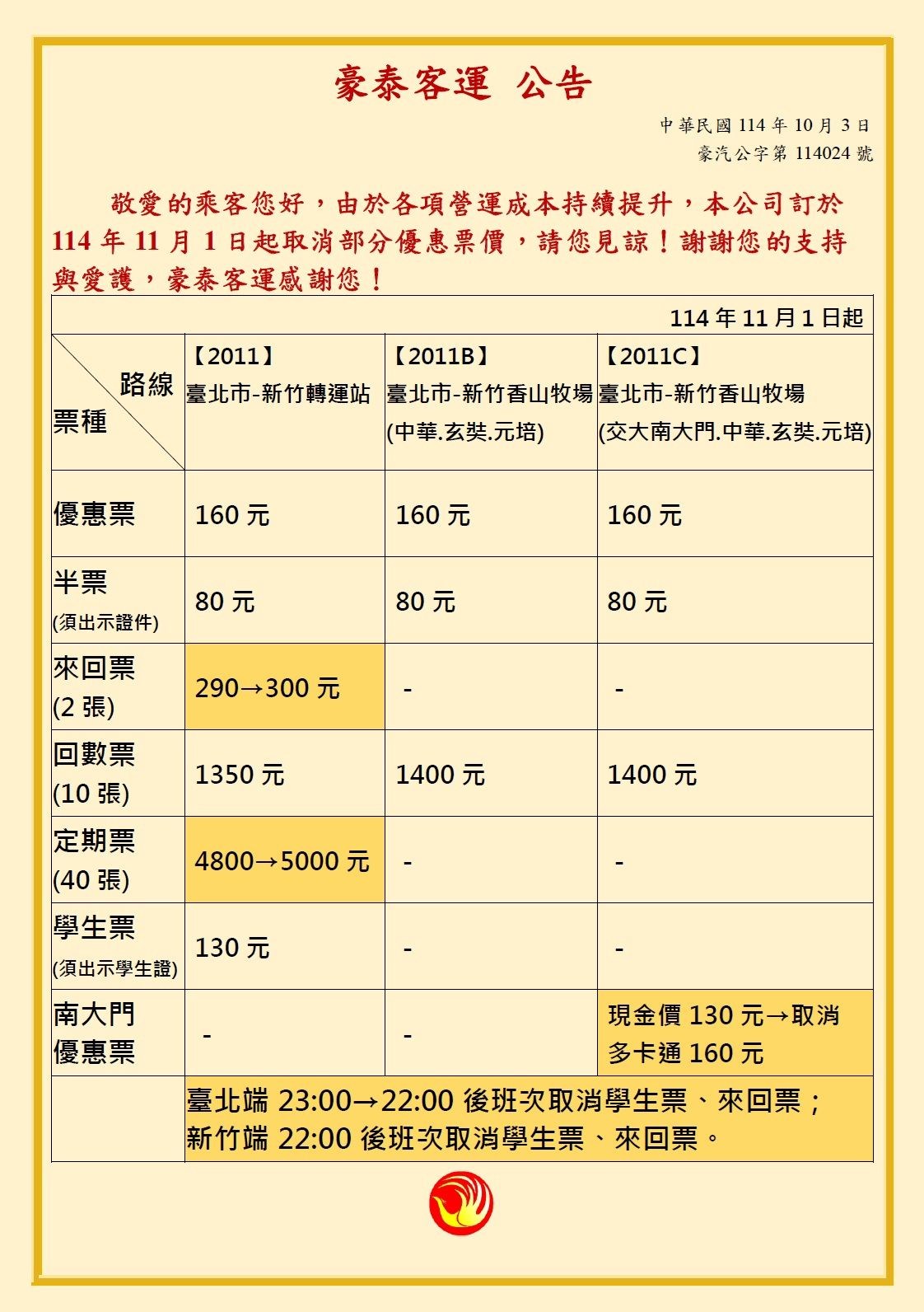 敬愛的乘客您好,由於各項營運成本持續提升,本公司訂於114年11月1日起取消部分優惠票價,請您見諒!謝謝您的支持與愛護,豪泰客運感謝您!