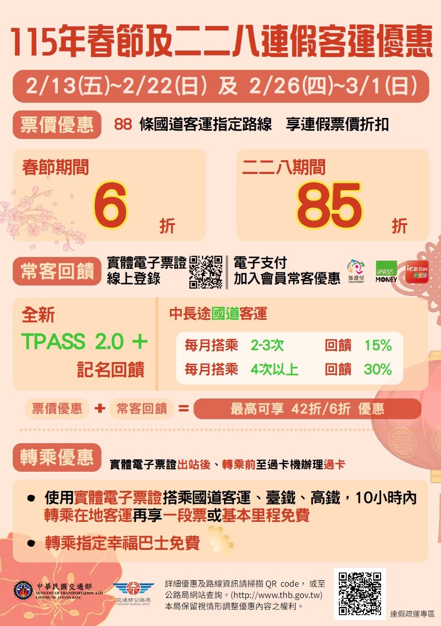敬愛的乘客您好,本公司參與交通部公路局115年春節及228連假國道票價及轉乘優惠活動,本公司路線「【2011】臺北市-新竹轉運站」主線提供票價折扣優惠、轉乘優惠,歡迎各位乘客多加利用,謝謝您!