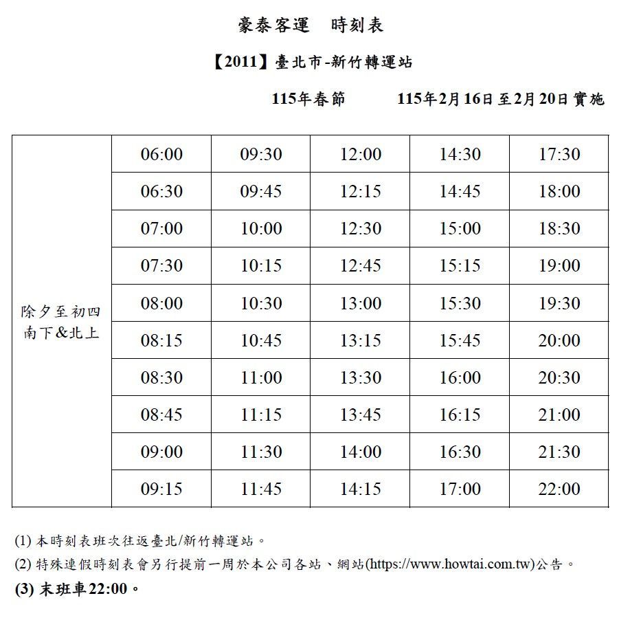 【2011】115年春節 臺北市-新竹轉運站時刻表 (2/16~2/20)