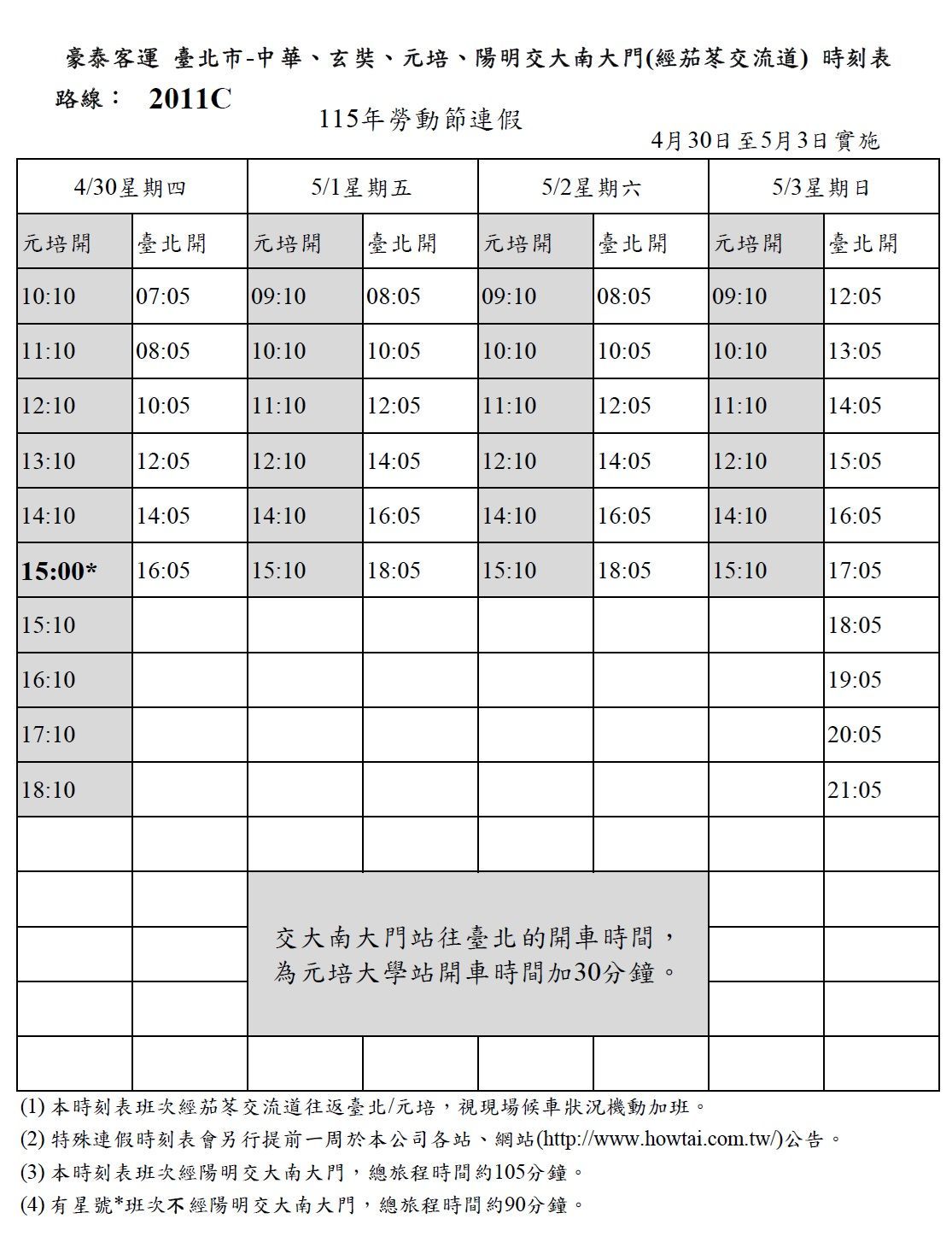 【2011C】臺北市- 中華、玄奘、元培、陽明交大南大門 時刻表 (115/2/22起)(有星號*班次 不 經陽明交大南大門)
